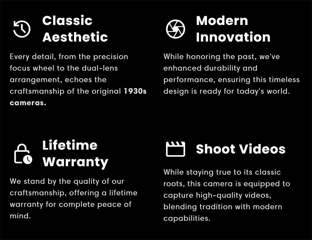 كل تفصيل، من عجلة التركيز الدقيقة إلى عدستي التصوير المزدوجة، يعكس براعة الكاميرات الأصلية من ثلاثينات القرن الماضي