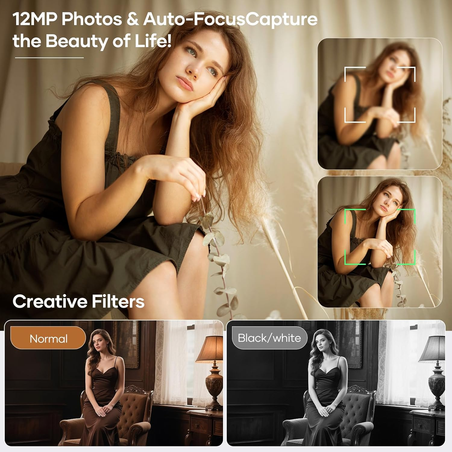 تلتقط الكاميرا صورًا عالية الجودة بدقة تقريبية تبلغ 12 ميجابكسل، 1920×1080 بكسل. مثالية للتصوير العادي والإبداعي على حد سواء.