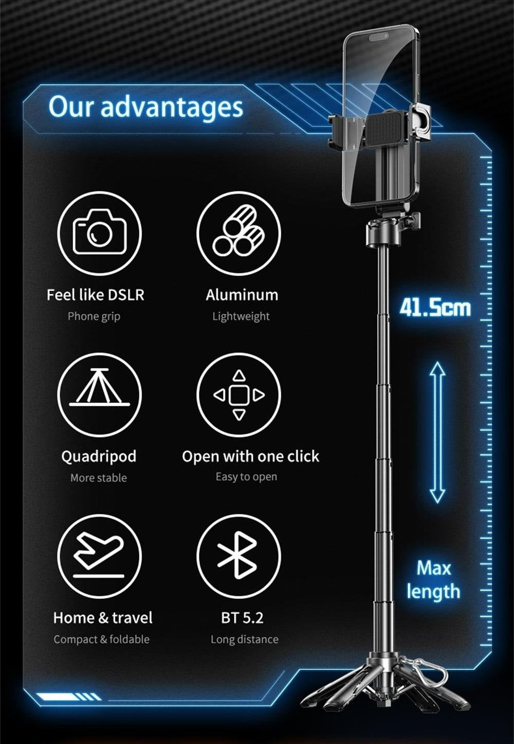 استمتع بتجربة تصوير تشبه الكاميرات الاحترافية مع قبضة الهاتف المريحة، وصناعة خفيفة من الألمنيوم لسهولة الحمل. يأتي حامل السيلفي بتصميم رباعي الأرجل لمزيد من الثبات، ويمكن فتحه بلمسة واحدة فقط. مثالي للاستخدام في المنزل أو أثناء السفر، بفضل حجمه القابل للطي. يدعم تقنية Bluetooth 5.2 لنقل الصور عن بُعد، ويمتد حتى 41.5 سم لتغطية أوسع وزوايا تصوير مدهشة.