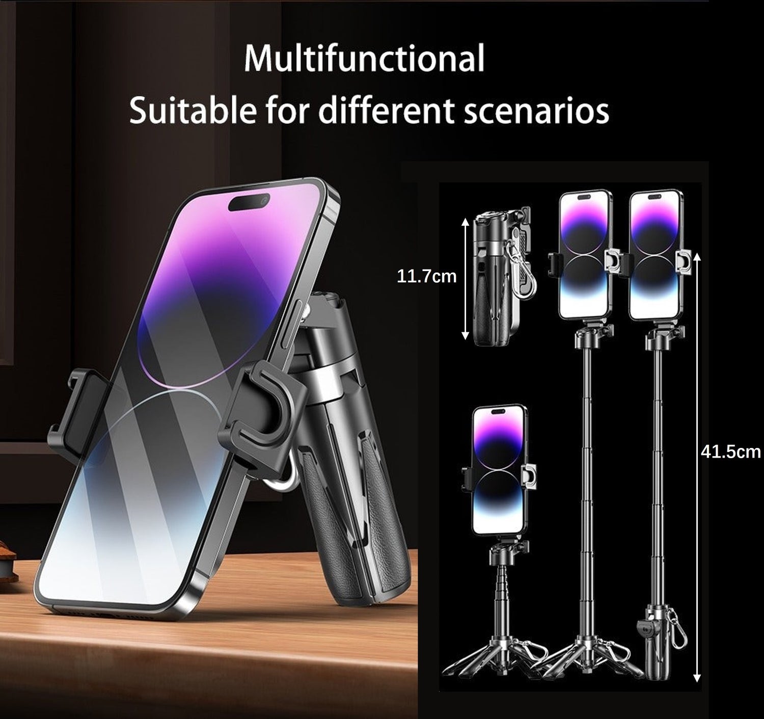 تصميم ذكي قابل للتعديل بارتفاع يتراوح من 11.7 سم إلى 41.5 سم، مما يجعله مثالياً لمختلف السيناريوهات — سواء كنت تستخدمه كحامل مكتبي، أو كحامل ثلاثي القوائم للتصوير في الهواء الطلق. حجمه المدمج يجمع بين المرونة وسهولة الحمل.