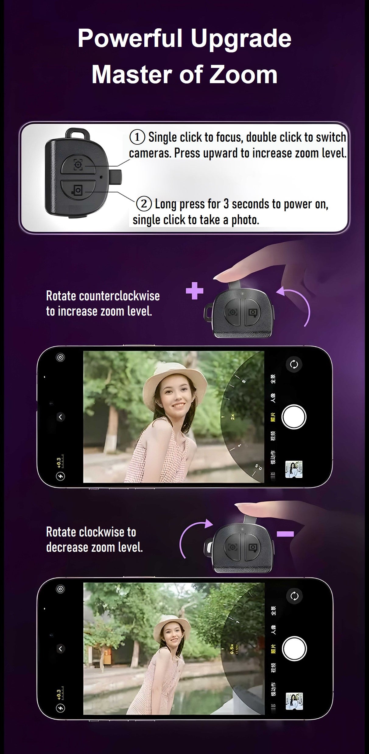 ارتقِ بتجربة التصوير مع نسخة الزووم سبين الجديدة، المزودة بزر تركيز ومفتاح دوار لتكبير أو تصغير الصورة بسهولة. يمكنك التبديل بين الكاميرات، وضبط البؤرة، والتقاط الصور دون الحاجة للمس الشاشة. كل ذلك بلمسة واحدة تمنحك تحكمًا سلسًا ونتائج احترافية.